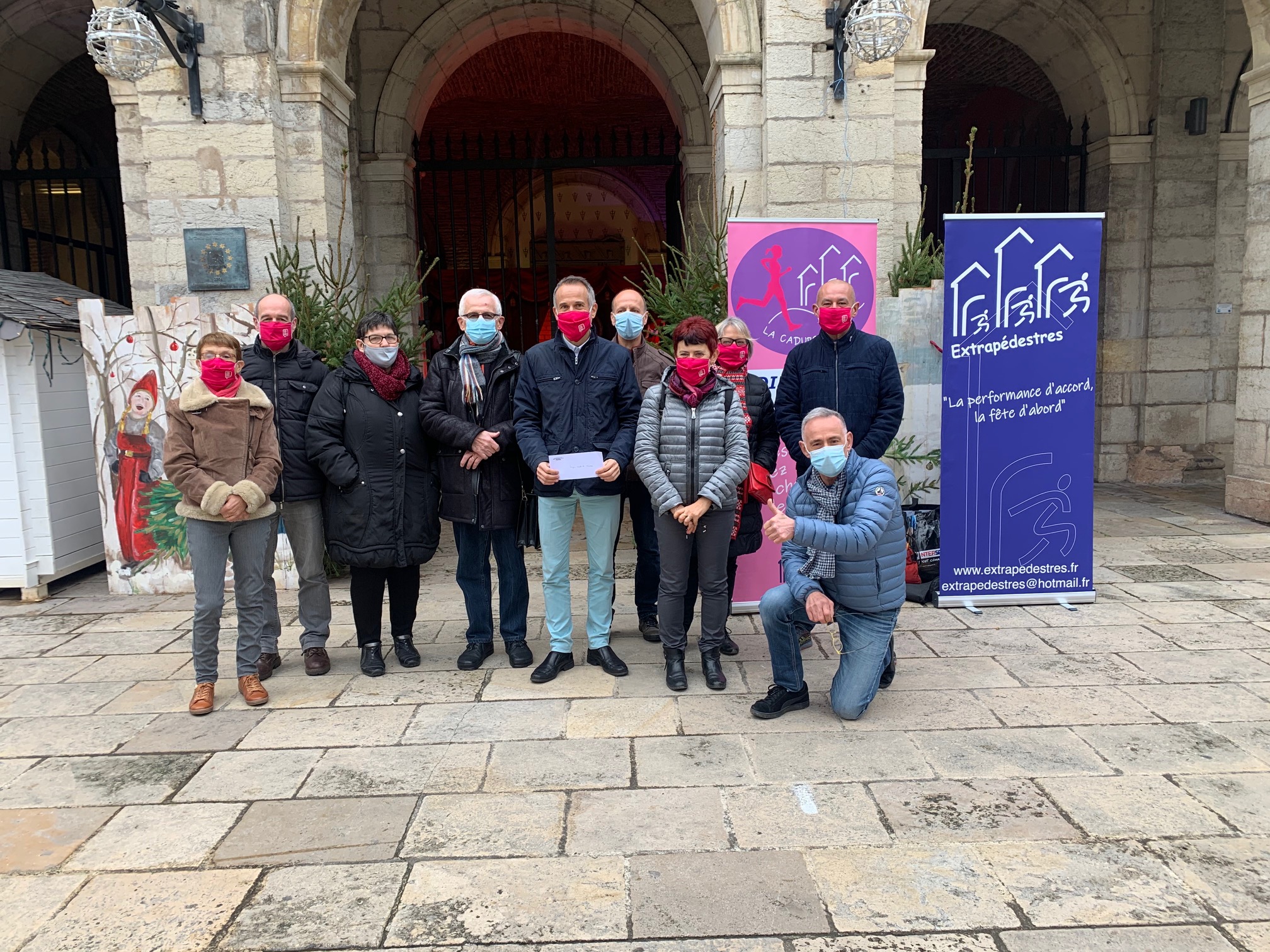 Des sourires derrière les masques. Ce mercredi 23 décembre, Gilles Cluzet pour les Extrapédestres a remis un chèque de 7000 euros au Dr Jean-Pierre Tricot, président du comité du Lot de la Ligue contre le cancer. « Il n’y a pas eu de Cadurcienne 2020 mais le club s’est mobilisé avec une grande collecte de fonds et une cagnotte sur internet. Nous avons ainsi récolté 7000 euros pour la Ligue : 6020 de dons et 980 via internet. Les masques ont été offerts par le Département » a précisé Gilles Cluzet. Les 3/4 de la somme iront à la recherche et le quart restant à l’accompagnement des malades. Félicitations !