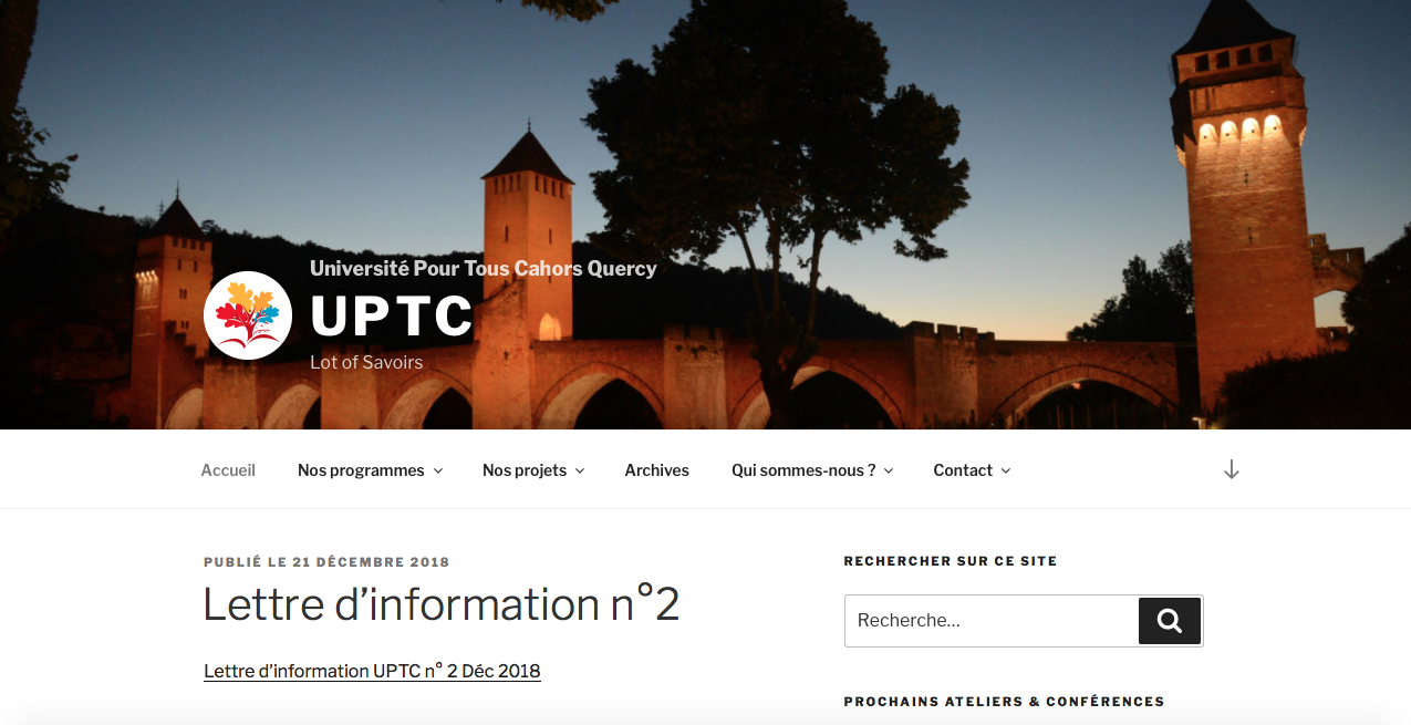 > L’UPTC a été officiellement créée le 30 août. A ce jour l’association a enregistré près de 150 adhésions, et compte dans son carnet d’adresses 200 sympathisants et une dizaine de partenaires, ce qui est un beau succès pour un démarrage en si peu de temps. Pour l’année universitaire 2018-2019, l’UPTC a fait le choix de donner la priorité à des intervenants résidant dans le Lot et de valoriser leurs qualifications universitaires et parcours professionnels dans les champs divers de la connaissance et des savoirs : Arts, Littérature, Philosophie, Sciences de la vie et de la terre, Généalogie, Histoire, Architecture, Prévention Santé… Dès ce mois de décembre, un premier atelier (complet) a démarré : généalogie, avec une trentaine de participants, répartis en deux groupes, sur un cycle de cours allant jusqu’en juin 2019. D’autre part, une conférence « Prévention Santé » a eu lieu ce vendredi 21 décembre après- midi, animée par le Docteur Botreau Bonneterre autour du thème « Retour sur les Etats Généraux de la Prévention Cancer ». En janvier prochain, deux autres ateliers vont démarrer : philosophie le 16 janvier après- midi, et histoire du Moyen Orient le 17 janvier après-midi. Egalement en janvier, une conférence Musique(s) aura lieu le 29 janvier prochain (10h à 12h), animée par Albertus Dercksen sur le thème « le canon, ce n’est pas que Frères Jacques »