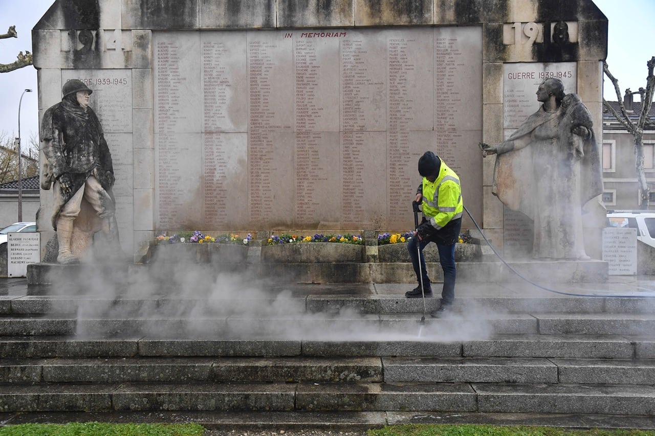 Une entreprise spécialisée est à pied d’oeuvre. Le monument aux morts de la place Charles de Gaulle fait l’objet d’un nettoyage complet. Pour effacer les