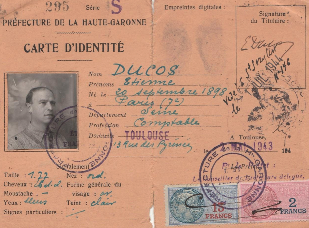 La chronologie de l’entrée en résistance (ou plutôt dans la résistance) de Charles Hilsum, ses premiers contacts, ses premières actions : tout cela n’est pas précis et, comme pour l’ensemble de sa biographie, doit encore faire l’objet de recherches. Cette vie en forme de roman reste à écrire. Mais il y a des faits, des documents, des témoignages. Comme par exemple une fausse carte d’identité au nom d’un prétendu Étienne Ducos, comptable, domicilié à Toulouse, datée de mai 1943 et visée en juillet 1944 encore par le maire de Saint-Sozy mais ornée de la photo de… Charles Hilsum, ou une autre carte d’identité avec cette même photo mais tamponnée en Ardèche et demeurée vierge.