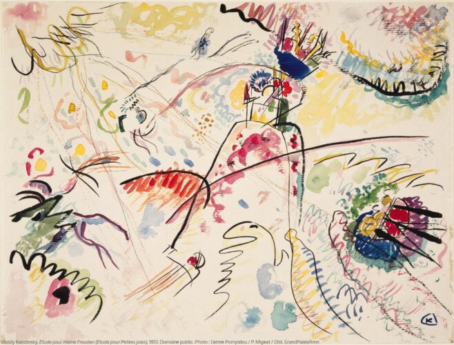 A noter qu’une exposition « Kandinsky la musique des couleurs » se tient actuellement à Paris au Musée de la musique-Philharmonie de Paris , et regroupe 200 œuvres et objets de l’atelier du peintre; elle est l’occasion de voir des tableaux en vrai et ainsi de percevoir les textures, les superpositions, les nuances de couleur.