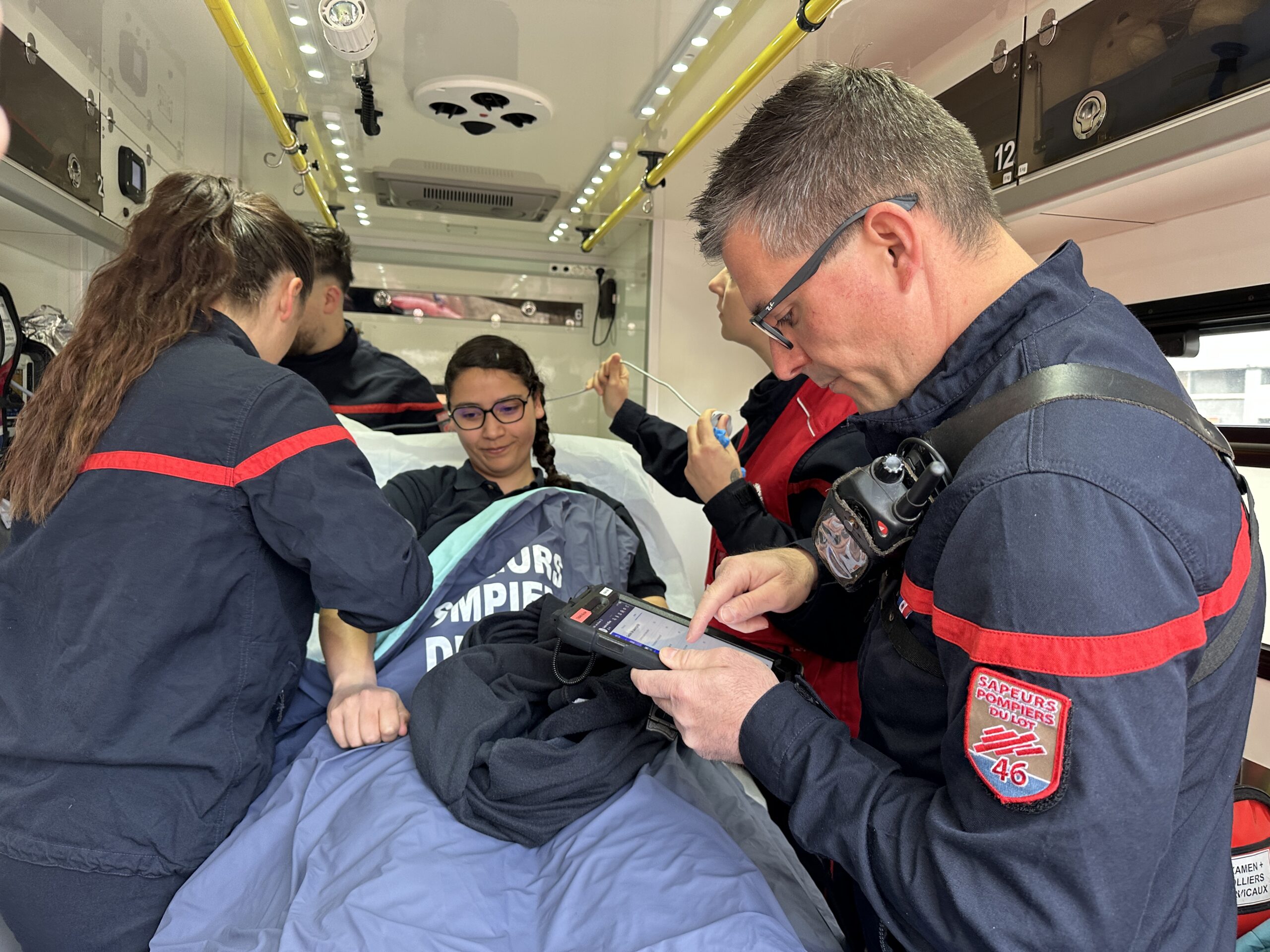 Ce 23 mars, simulation d’intervention pour les pompiers du Lot entre la rue des Jardiniers à Cahors et les urgences de l’hôpital. Objectif : présenter à la presse la nouvelle tablette numérique Secours et Soins d’Urgence Aux Personnes (SSUAP) opérationnelle depuis le 20 janvier dernier. « C’est un enjeu de service public. Un projet que nous avons mené en 3 mois et demi grâce à l’accompagnement de l’Etat, du SAMU, et de nos élus. La tablette est une passerelle entre l’équipe d’intervention, le centre opérationnel, le SAMU et les centres hospitaliers. En terme de résultats, c’est bluffant. Les diagnostics sont rapides, pertinents et les plus partagés possible. Les pompiers se sont appropriés l’outil rapidement, un outil ergonomique pensé pour les utilisateurs de terrain. Le système n’est pas gourmand en bande passante ce qui permet d’avoir un périmètre plus élargi » ont expliqué le colonel Patrick Magy, directeur départemental adjoint du SDIS, et le lieutenant-colonel Virgile Moreau, chef du groupement d’analyse et de couverture des risques. Un véritable + !