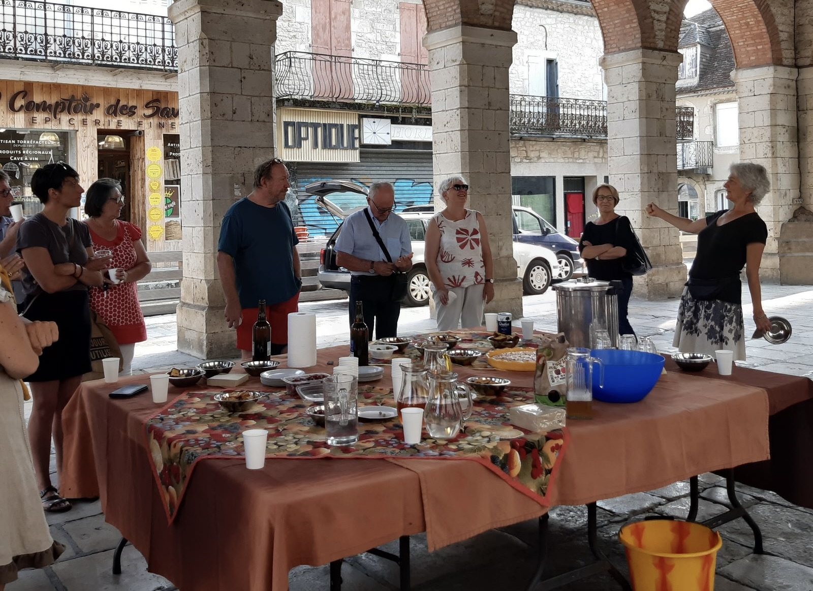 Ils étaient une trentaine… festoyant chaleureusement sous la halle. Buffet coloré, cakes maison et soupe froide pour tous ! L’association « Enchantons les vitrines de Gramat »créée fin avril 2023, a réuni adhérents et sympathisants le mercredi 28 juin pour une rencontre d’ouverture à plus d’enchantements… En effet, une déambulation dans la ville, sous la houlette de la présidente de l’association faisant sonner ses bols de métal, a permis d’inaugurer les nouveaux exposants des vitrines remises en état par l’association :