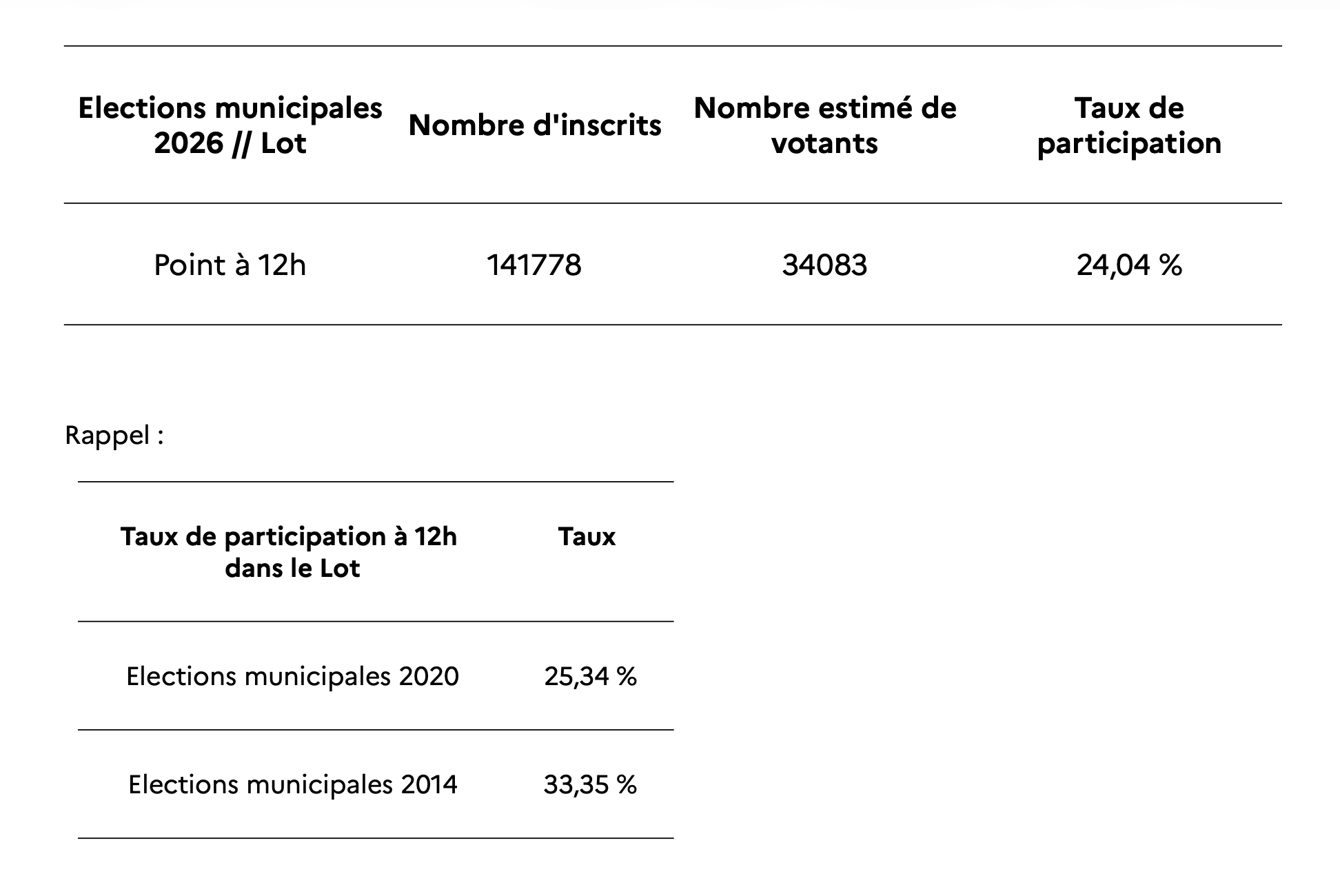 La préfecture du Lot a communiqué le taux de participation à midi pour le 1er tour des élections municipales 2026 ce dimanche 15 mars : 24,04 %
