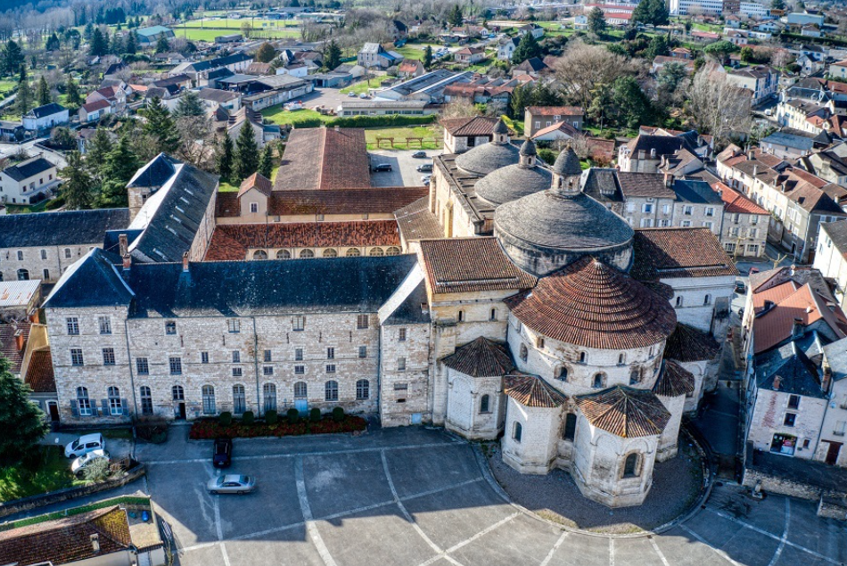 > Chef d’œuvre de l’art romano-byzantin du Haut-Quercy, cet édifice trouve ses origines dans un petit monastère bénédictin du Xème siècle. Entre 1145 et 1150, l’achèvement de la construction des bâtiments religieux à Souillac représente un des plus beaux ensembles du sud-ouest. Par la suite, l’église abbatiale souffrit de l’occupation anglaise lors de la guerre de Cent Ans puis des guerres de religions dans la seconde moitié du XVIème siècle, époque à laquelle son portail fut déplacé à l’intérieur de l’église afin de le protéger. Après une première restauration en 1712, des réparations furent engagées en 1802 puis entre 1842 et 1848. Au début du XXème siècle, pour rendre visible la file de coupoles, des calottes de béton furent mises en œuvre afin que ces dernières puissent recevoir les lauzes et les lanternons qui la coiffent aujourd’hui. L’église abbatiale présente ainsi un caractère unique et abrite également un mobilier remarquable tel qu’un tableau de 1844 de Chassériau intitulé Le Christ au Jardin des Oliviers, ainsi qu’un orgue monumental exécuté en 1855 par le facteur d’orgue Stoltz et classé au titre des monuments historiques. En outre, à l’intérieur, le portail mauriste est un des chefs-d’œuvre de la sculpture romane.