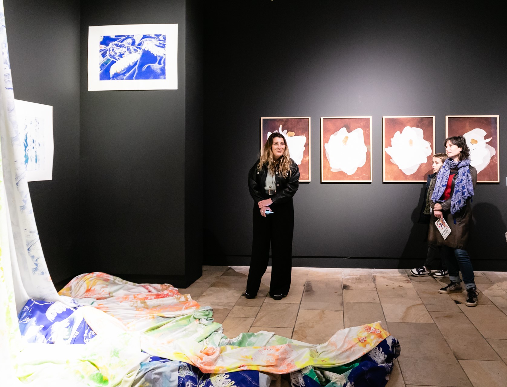 Lisa Tararbit, plasticienne franco-kabyle, met à l’honneur la robe amazigh qui représente un symbole de résistance au travers des âges en dépit des colonisations diverses que l’Algérie a subies… Émerveillée par le lieu, ce beffroi souillagais, et sa nef imposante, elle a créé un sublime drapé en référence aux lieux sacrés même désacralisés, aux sculptures des églises et leurs propres drapés. Son œuvre en soie, toile et crêpe est constituée d’images réalisées à partir de photos algériennes et de robes de sa tante kabyle. Elle utilise pour ce faire la sérigraphie comme procédé pictural et non de reproduction. À ses côtés sont présentés des derviches tourneurs de Charles Fréger dont la transe s’accommode avec la spiritualité environnante.