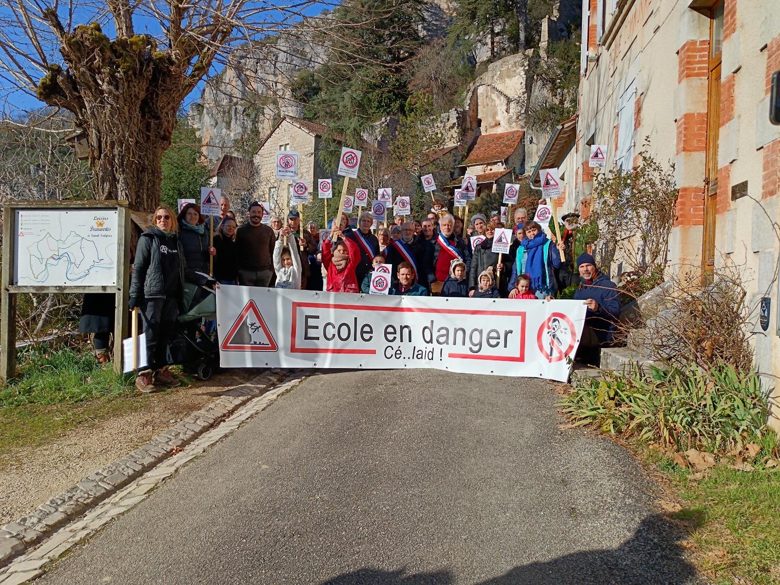 « Ecole en danger Cé…laid » 2 rassemblements à Saint-Sulpice et à Marcilhac ont eu lieu ce 31 janvier et ce 1er février pour dénoncer « le projet dévastateur de l’éducation nationale de supprimer une classe de primaire sur les trois de la vallée du Célé » (RPI Brengues – Espagnac – Marcilhac-sur-Célé – Saint-Sulpice – Sauliac-sur-Célé). Et d’expliquer les raisons de leur colère : « Le 21 janvier 2025, la DASEN a informé les syndicats d’enseignants qu’elle prévoit, à la rentrée 2025, de déplacer l’enseignante de l’une des 3 classes du RPI de la vallée du Célé, ce qui revient à fermer la dernière école d’un village. Une réunion finale est programmée le 11 février, à l’issue de laquelle la décision sera officialisée. L’absence remarquable de concertation préalable, l’approche technocratique revendiquée sans fard par la DASEN, et la brièveté du délai entre l’annonce et la conclusion permettent d’affirmer que, dans l’esprit des services de l’État, la réunion programmée est de pure forme. Or les habitants et les acteurs économiques de la vallée du Célé s’y opposent et dénoncent une décision inique qui fait payer aux enfants de ce territoire rural la nonchalance de certains services de l’État, qui semblent préférer pénaliser un territoire rural où les opposants potentiels sont moins nombreux qu’en ville et où ils semblent supposer que des arguments fallacieux seront plus facilement acceptés. Ce projet pénalise injustement les enfants de la vallée du Célé par rapport à ceux des aires urbaines, il focalise une économie marginale pour l’académie dans un territoire rural où les effets en seraient plus dévastateurs qu’ailleurs, il érode la confiance des citoyens dans l’État, et il nuit gravement à la santé économique et humaine de ce territoire rural et enclavé. Et ce projet est en contradiction frontale avec la politique affichée avec fermeté par le gouvernement au niveau national, qui consiste notamment à « améliorer le taux d’encadrement des élèves » et à « préserver l’école rurale, malgré la baisse démographique marquée » ! L’inspection d’académie doit renoncer définitivement à ce projet de réduction des classes. Elle doit en outre s’engager dans la durée :